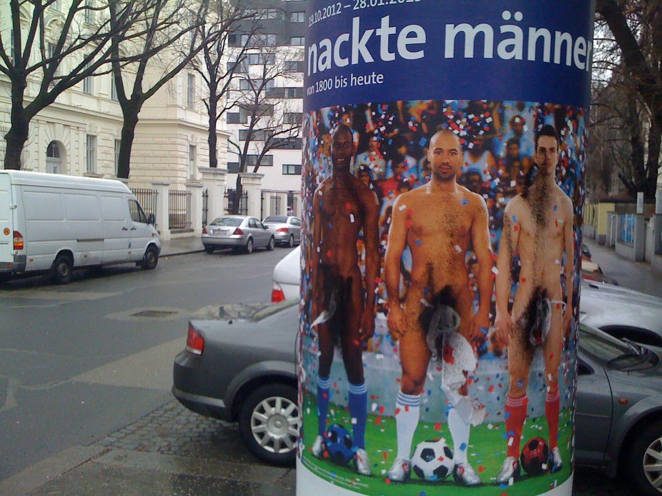 An exhibition in Vienna’s Leopold Museum, which became talk of the town fast in Fall, has tried to close that flesh-colored gap. Instead of being modest, the makers decided to show all they had right from the start: a larger-than-life male nude with a clearly visible penis was placed in front of the museum’s post-modern staircase to shock devout local Muslims as well as bigoted American tourists: fully frontal nudity Continental style! The colorful exhibition posters that show three soccer players of different skin color (nude of course) with their little big friends in all stages of initial erection were promptly castrated with black paint at several locations over the city. Whose penis envy had led to action, could not be ascertained; radical women’s groups seemed rather amused or pleased than outraged.