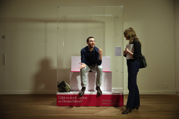 To critics of the show, called “The Whole Truth” and intended to demystify Jewish life for a curious but largely uninformed German public, it was neither the questions nor the answers that were controversial, but where Mr. Glucroft sat: in a glass box, like just another exhibit.”>full text & photo (c) NYT, 2013